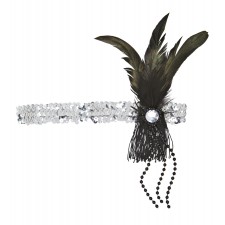 Fascia per testa charleston, argento in pailettes con piume nere e perline