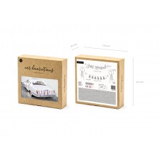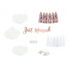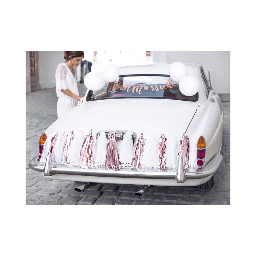 All'interno della confezione troverete: uno striscione con la scritta "Just Married" (Novelli Sposi) in color oro / rosa lunga all'incirca 77cm e di circa 20 cm di altezza, un banner di nappe sempre di colore oro / rosa, che potrete appendere sulla parte posteriore ed anteriore oltre che sulle maniglie delle portiere, lungo circa 150 cm e alto 30cm (semplice da montare in quanto dovrete semplicemente far passare il nastro in dotazione attraverso le fessure presenti sulle ghirlande e legarlo a 2 delle ventose della confezione) ed un secondo in bianco di 150 cm di lunghezza e circa 30 cm di altezza (da assemblare nella stessa maniera illustrata in precedenza), 10 palloncini bianchi del diametro di circa 23 cm, un nastro bianco satinato largo circa 1,2 cm e lungo approssimativamente 25m, 6 ventose ed una lenza di 12m di lunghezza.