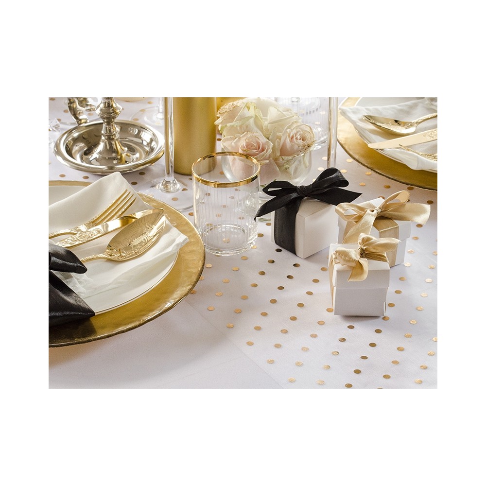 Ottimo addobbo per rendere il proprio evento migliore, grazie a questo rotolo di organza potrete dare un tocco colorato e allo stesso tempo raffinato al vostro party, il rotolo, presentato di colore bianco ed oro, vede stampata una decorazione in simil pizzo che ritrae dei pois in maniera tale da esser utilizzato per favorire l'eleganza dell'evento. Utile per qualsiasi tipo di festa, sarà ottimo come decorazione da tavola in vista di un pranzo o di una cena importante. Eccellente la scelta di utilizzare questo adorno alla cena di Natale o in prossimità delle feste natalizie.
