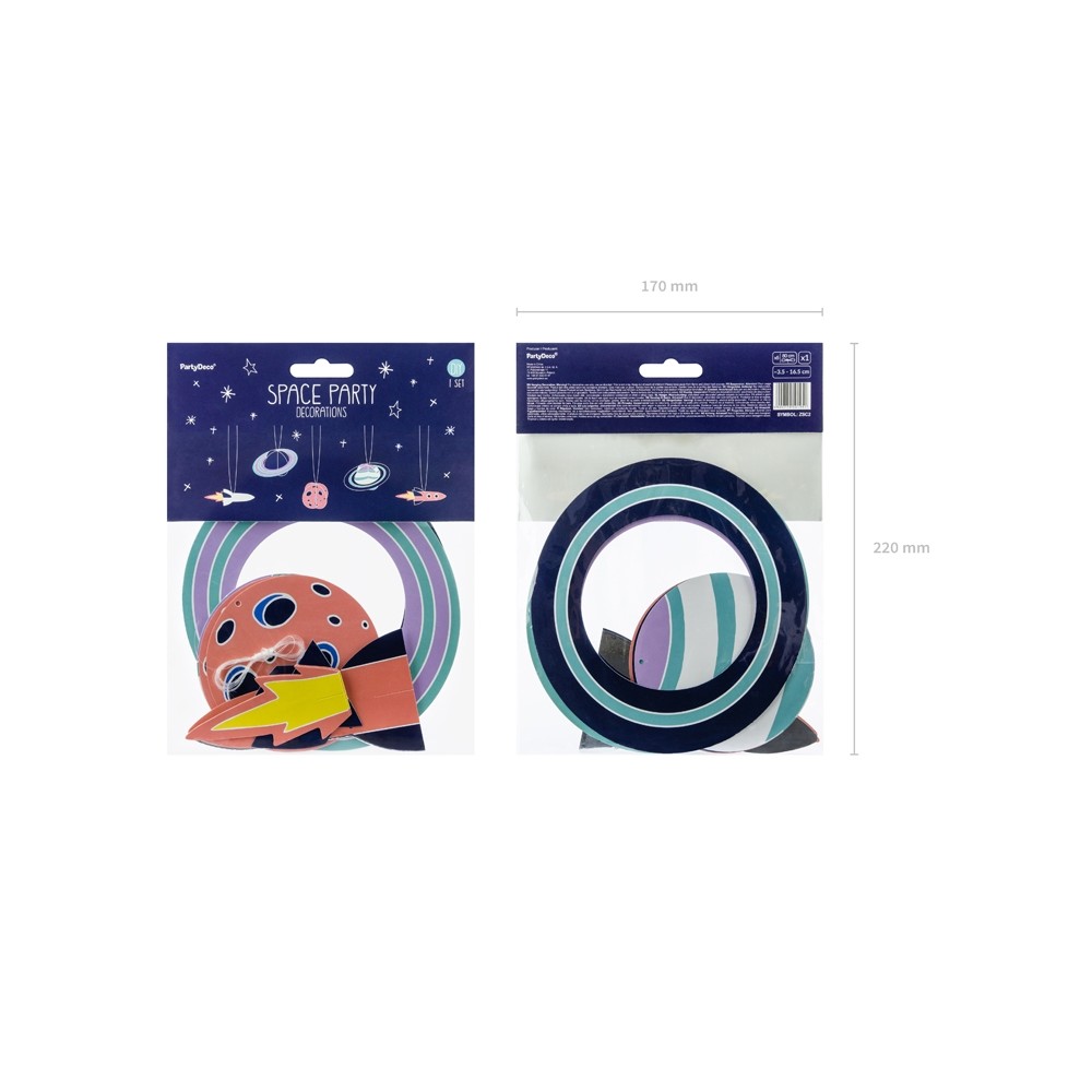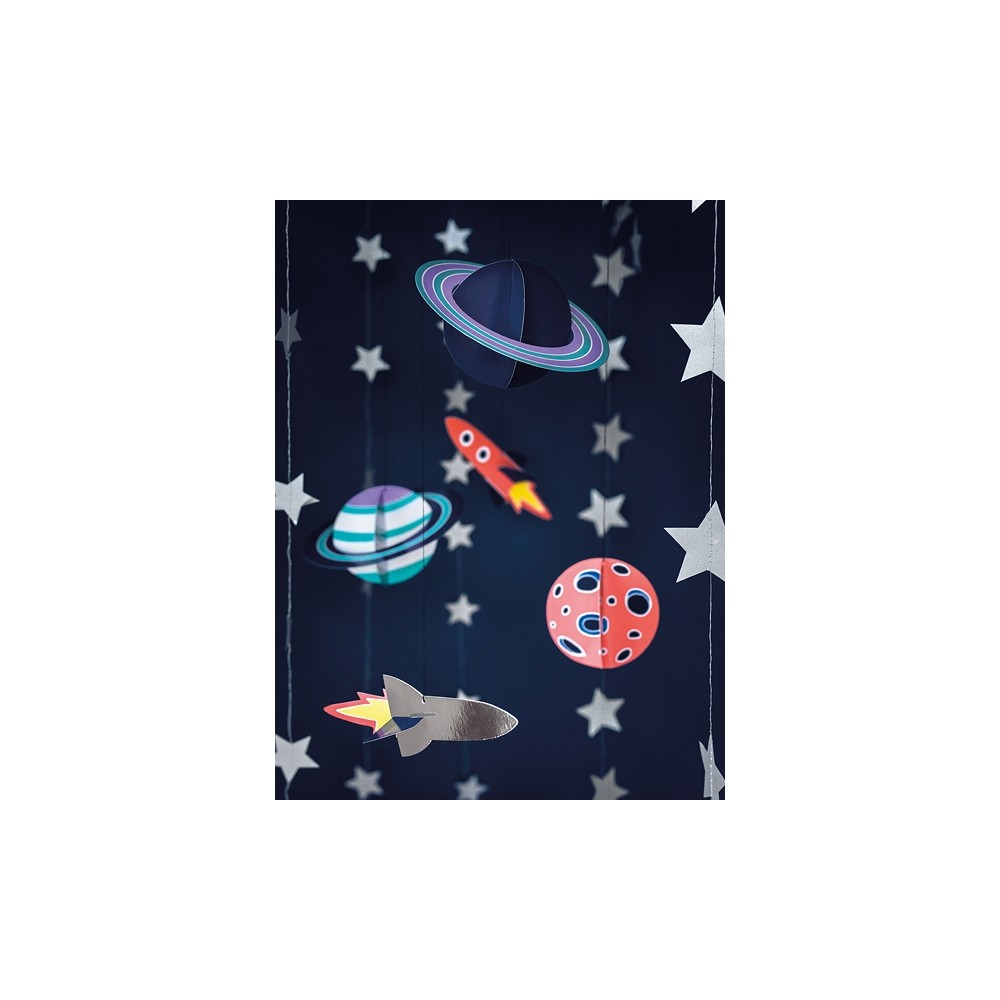 Per creare la giusta atmosfera per il tuo Space Party non puoi farti mancare questi particolari pendenti a forma di pianeti e di razzi spaziali. Il set contiene 5 decorazioni facili e veloci da assemblare.