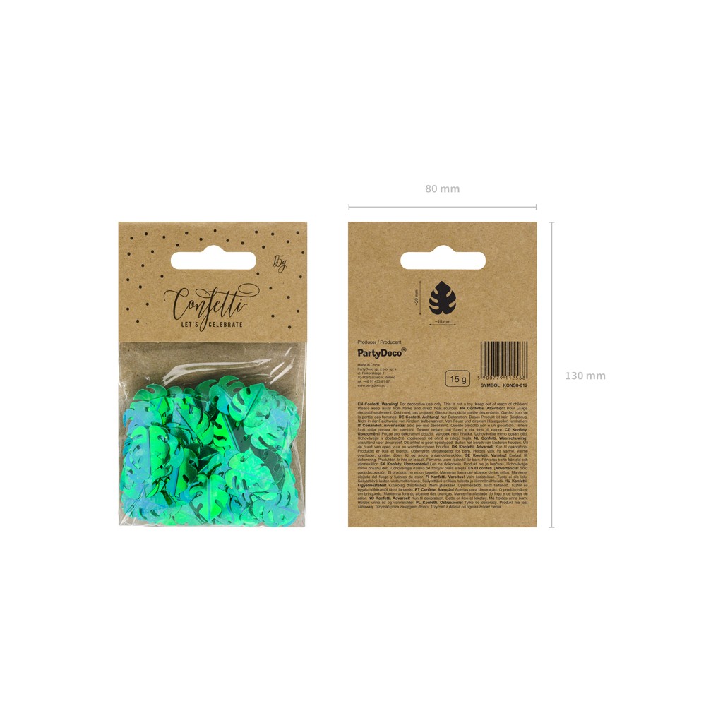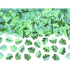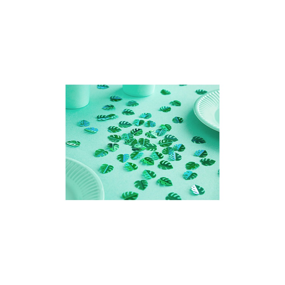 Confezione 15g confetti verdi metallizzati a forma di foglia tropicale in PVC. Ideale come ornamento da tavola per qualsiasi evento o festa a tema, ottima decorazione anche per una cerimonia con tema tropicale.