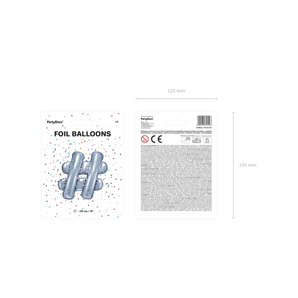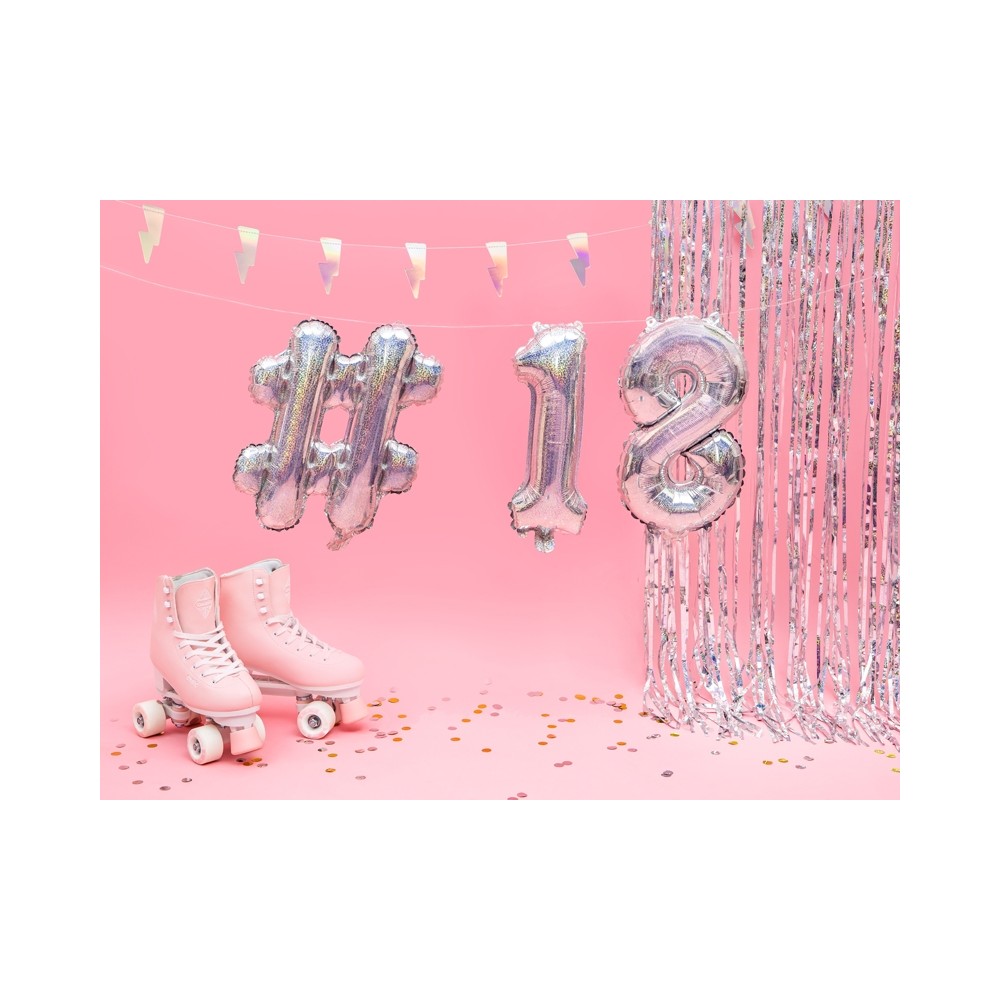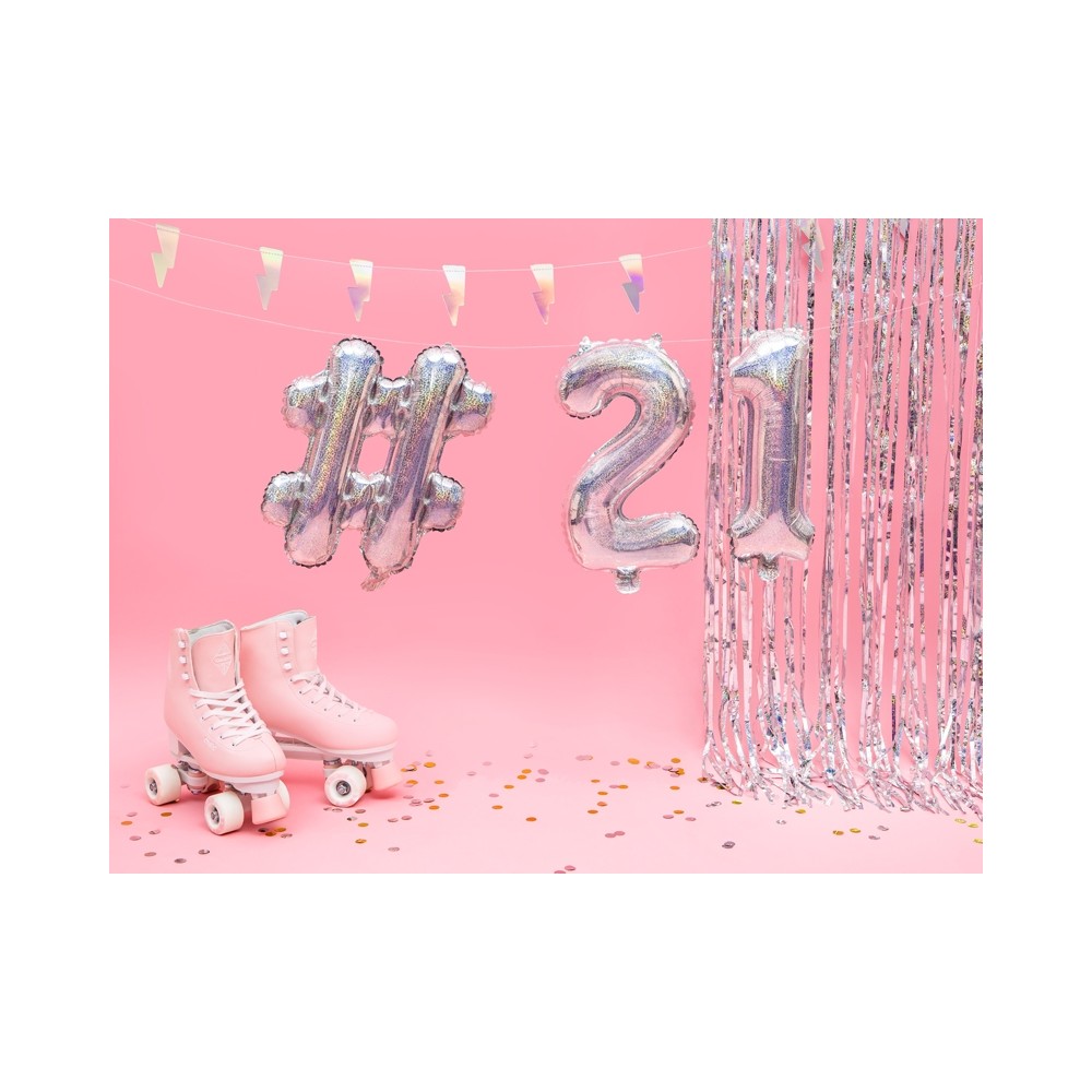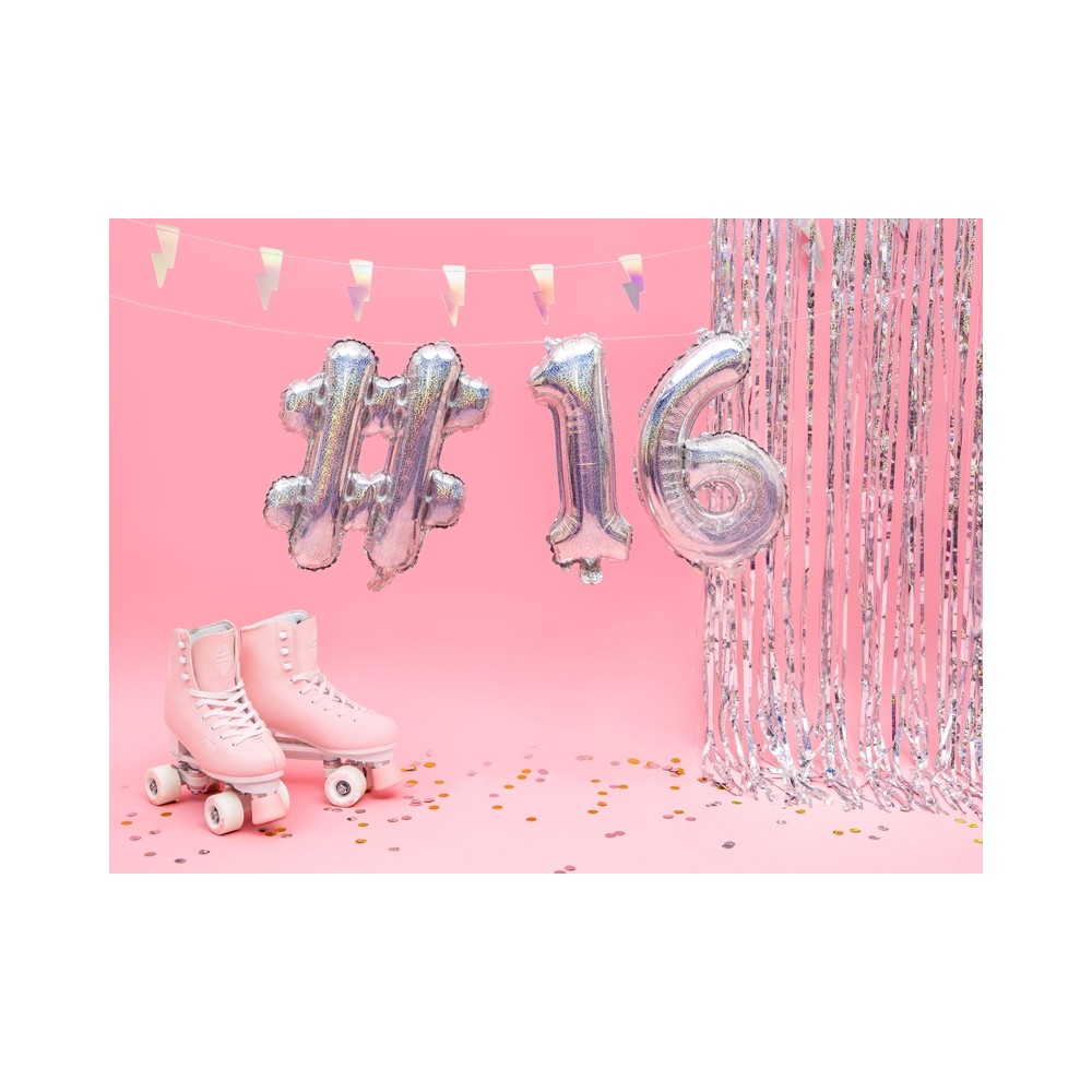 Un originale foil balloon a forma di # (cancelletto), perfetto per qualsiasi tipo di festa, in particolar modo per i compleanni per bambini, ragazzi e adulti. La particolarità di questo palloncino è il suo colore olografico, che lo rende "super brillante e luccicoso". Abbinalo ai numeri in mylar per comporre l'età del festeggiato o per il capodanno.