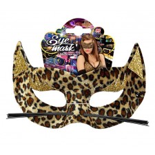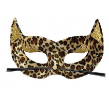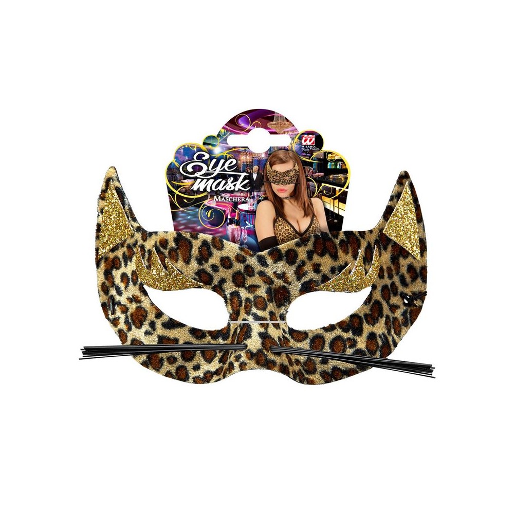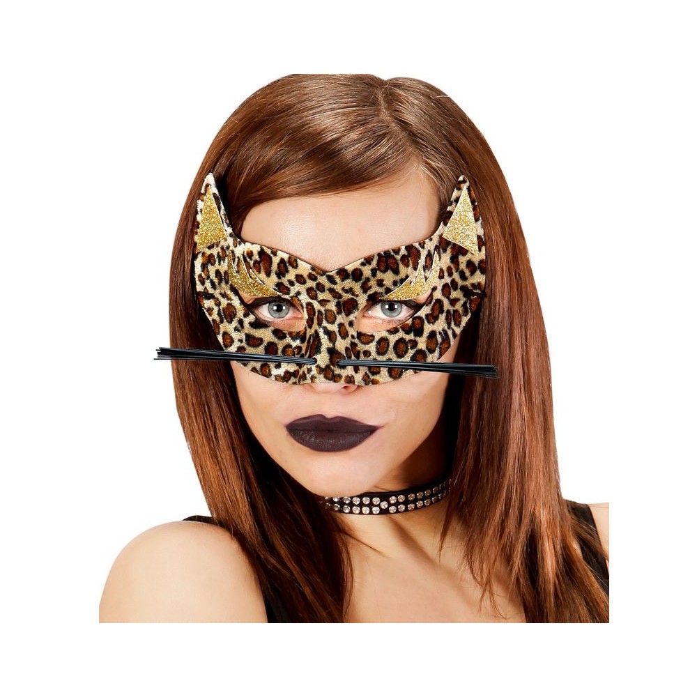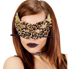 Mascherina mezzo viso in velluto leopardata con baffi e decorazione orecchie glitter oro