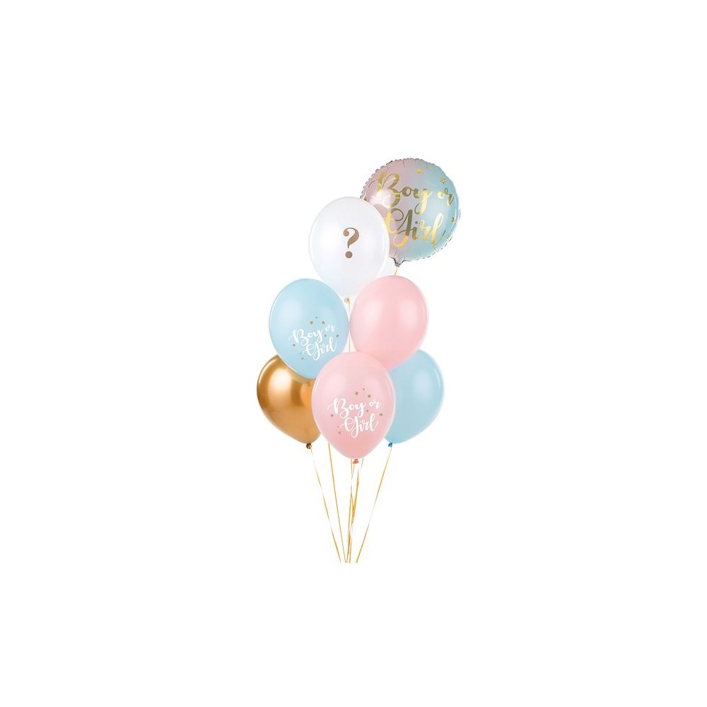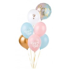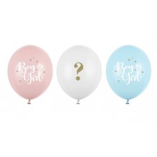 Palloncini in lattice di qualità assortiti in 3 modelli, rosa pastello con stampa" boy or girl", azzurro pastello con stampa "boy oro girl" e bianco con stampa in oro punto interrogativo.