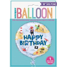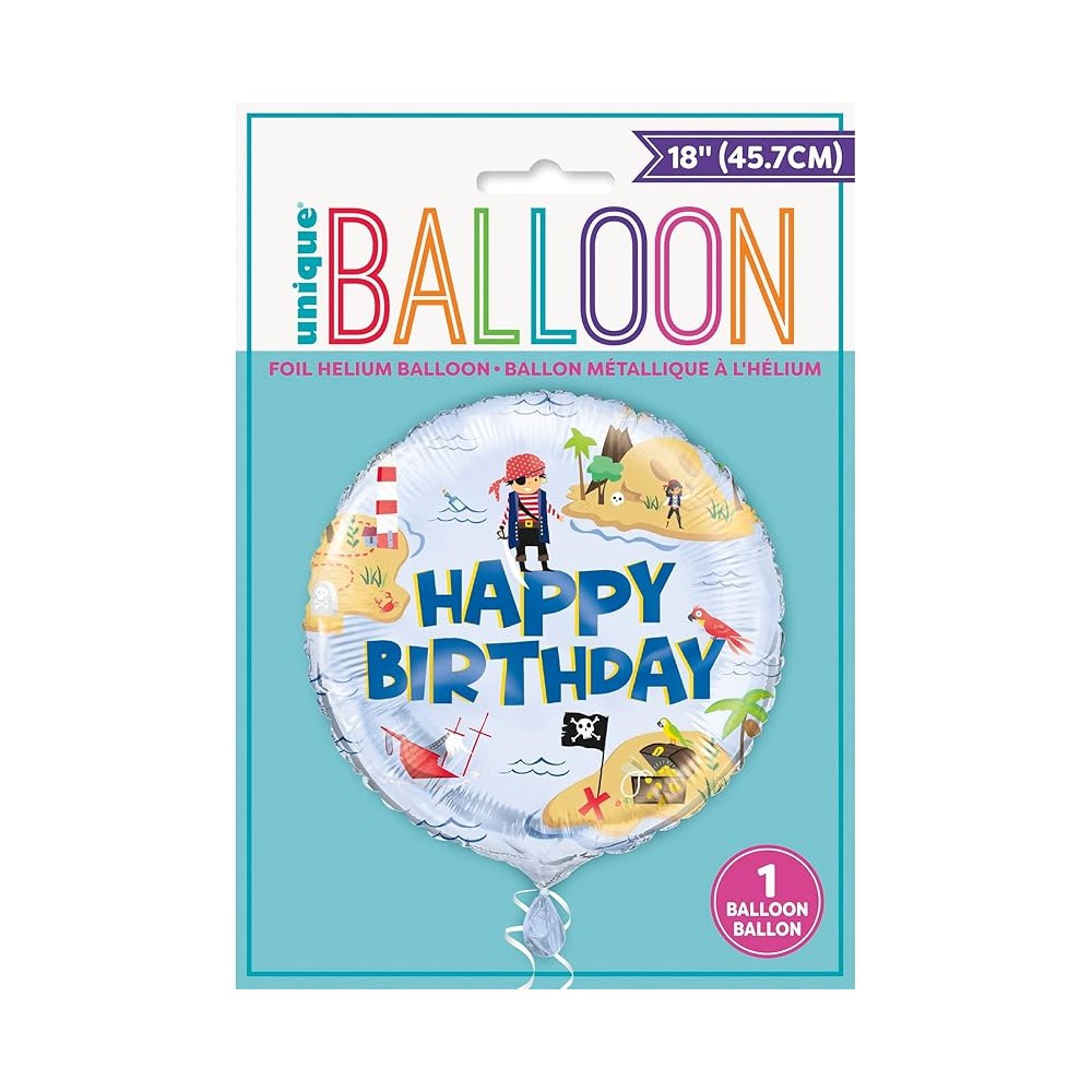 Palloncino in foil a tema pirati, perfetto per rendere indimenticabile una festa di compleanno. Il design vivace e colorato presenta un'isola del tesoro con pirati, navi affondate, forzieri e pappagalli, circondati dalla scritta centrale 'Happy Birthday' in caratteri grandi e festosi. Ideale per decorare l’ambiente e aggiungere un tocco di avventura alla celebrazione, può essere gonfiato con elio o aria per garantire un effetto scenografico e divertente.