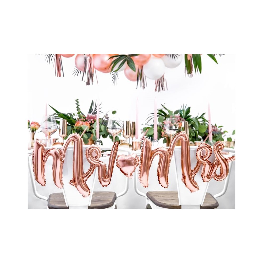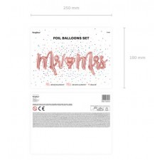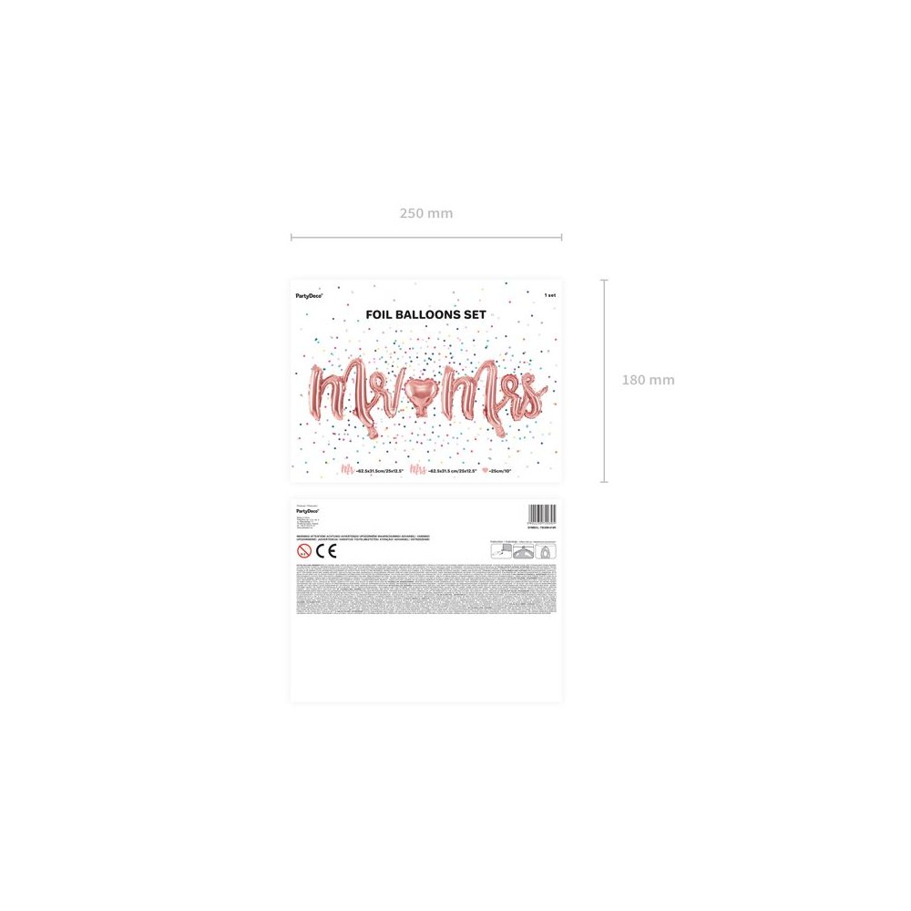 All'interno della confezione troverete 3 diversi palloncini: il primo con una scritta "Mr" (Signore) di 62,5 x 31,5 cm in colore oro / rosa, un secondo con la scritta "Mrs" (Signora) di 62,5 x 31,5 cm ed il terzo a forma di cuore, infine, con un diametro di 25 cm.