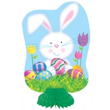 segnaposto mini centrotavola in cartoncino con coniglietto e decori pasquali, base a nido d'ape.