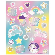 Ideale accessorio utilizzabile come regalino dopo festa al party di compleanno della propria bambina o bambino, inserite questi adesivi all'interno di un sacchettino, donateli al bimbo invitato, e guardatelo sorridere attaccando questi stickers nella propria cameretta. Presenti sui fogli 20 adesivi diversi tra loro, con stampe assortite di Unicorni.