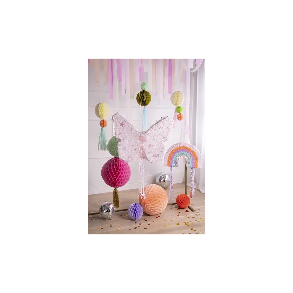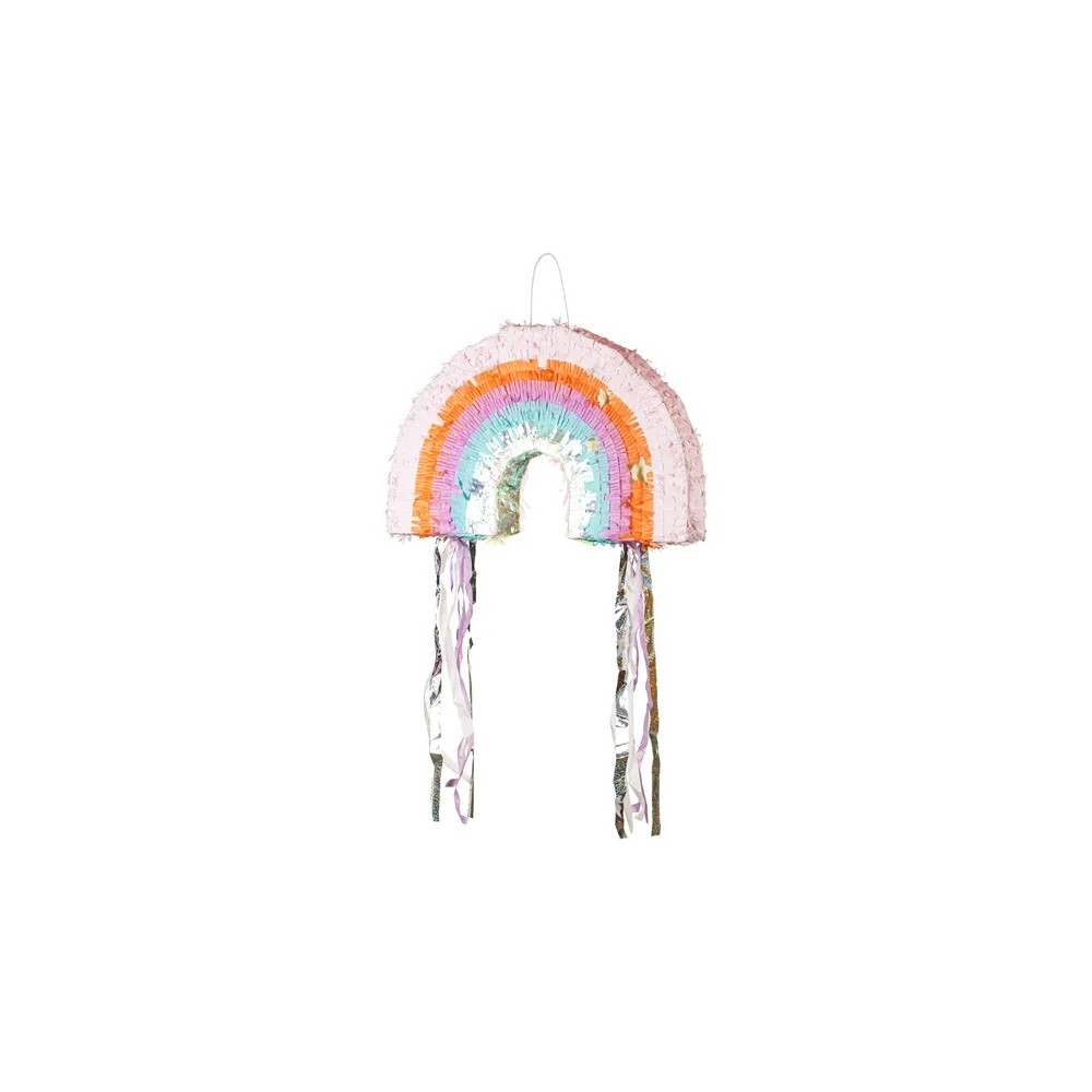 Porta un tocco di magia alle tue feste con questa pignatta a forma di arcobaleno! Realizzata in cartone colorato, è perfetta per essere riempita con dolci, piccoli regali o petali di fiori. Un'idea divertente e decorativa per compleanni, baby shower o feste a tema. Facile da montare e da appendere, la pignatta ha dimensioni compatte di 50x33x10 cm quando piegata. Aggiungi un'esplosione di colori e allegria al tuo evento!