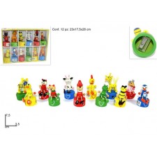 confezione con 12 temperini, temperamatite in legno, vari soggetti (animali e pinocchio).