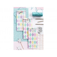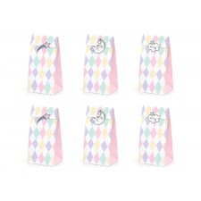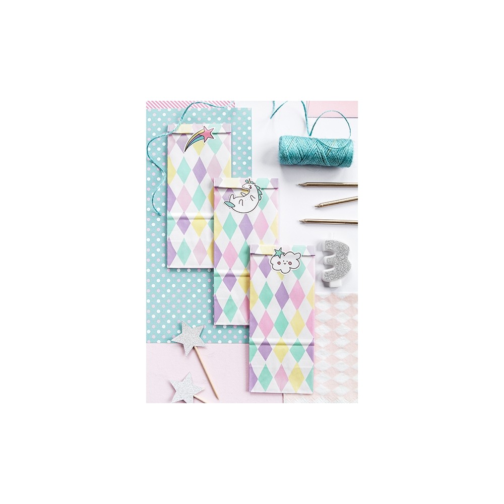 confezione 6 sacchetti colori pastello, con adesivi tema unicorno. ideali per feste