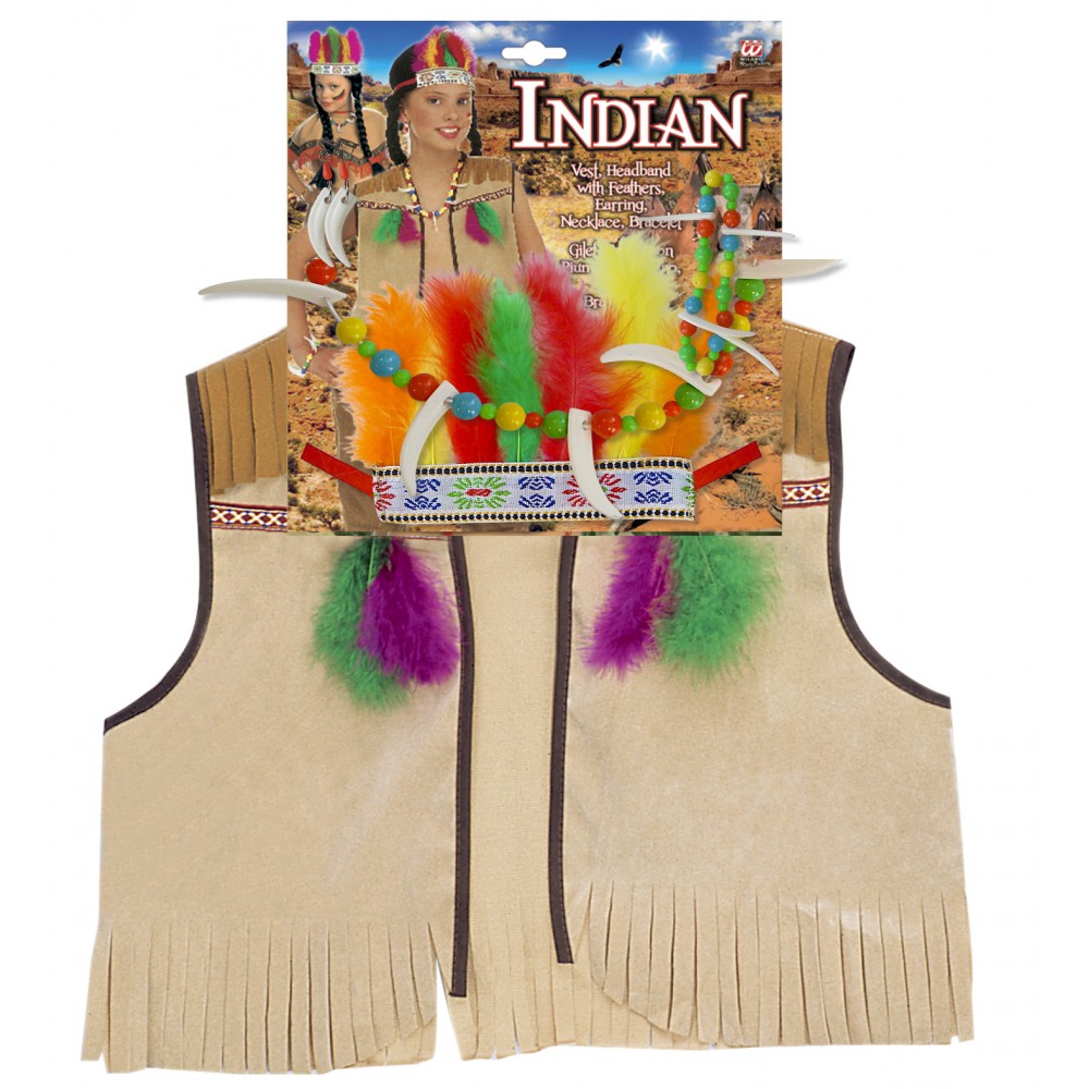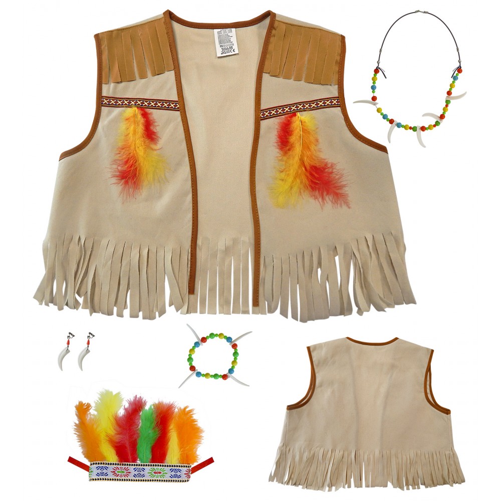 Set travestimento da indiano con gilet, fascia testa con piume, orecchino, collana, bracciale, Misura unica bambino