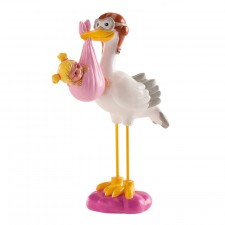 Una statuina ideale per decorare la torta per baby shower, nascite e battesimi. Questo cake topper rappresenta una cicogna con casco e occhiali da aviatore che tiene nel becco un fagottino rosa con una bambina occhialuta.