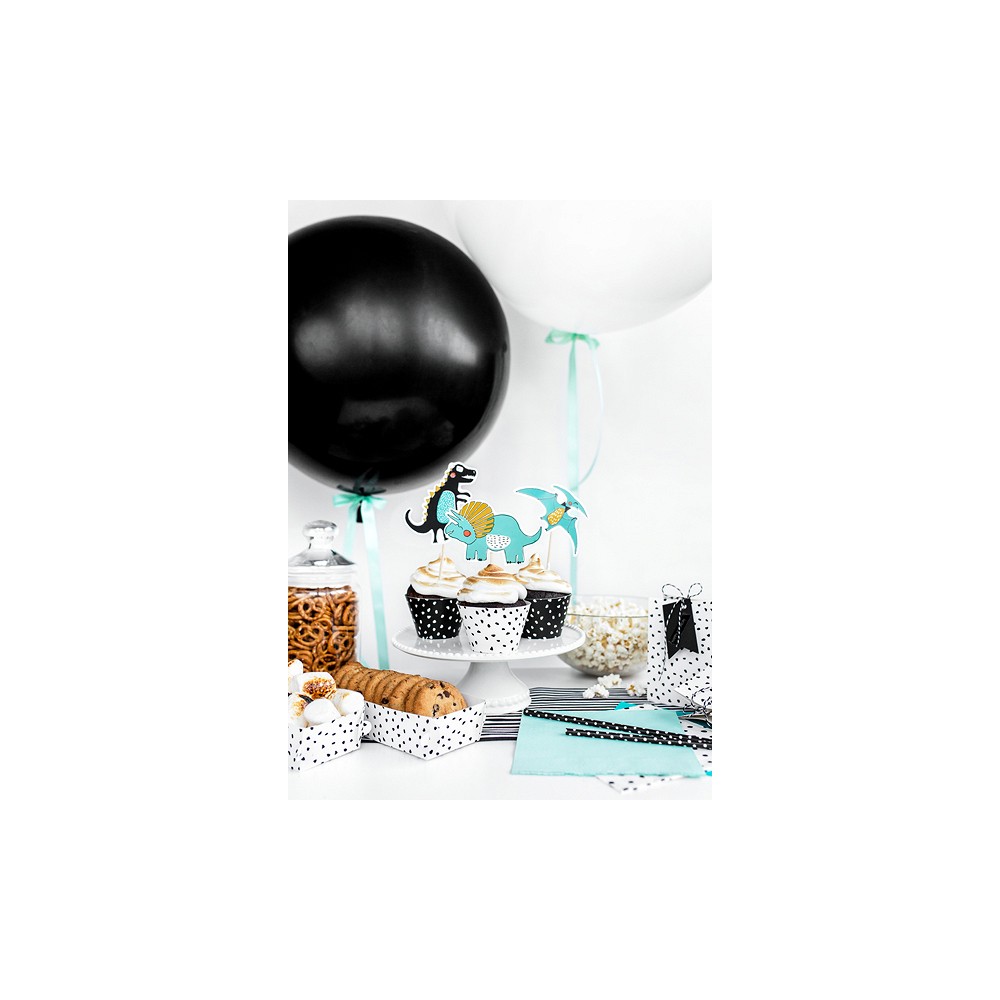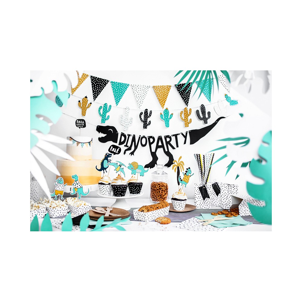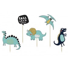 Un set di 5 topper pick Perfetti per decorare in modo originale la torta di compleanno, soprattutto se a tema dinosauri La confezione comprende 5 topper diversi: 1 scritta e 4 dinosauri diversi.