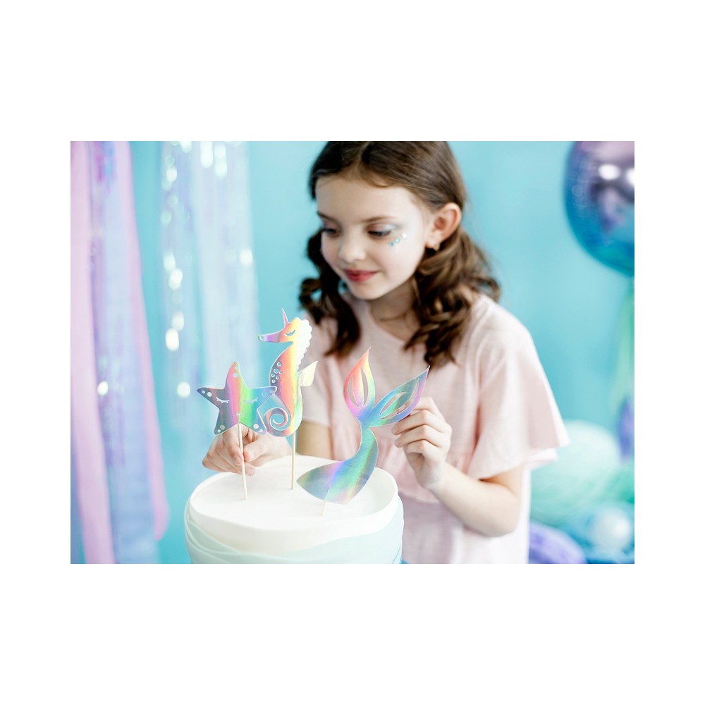 Un set di 5 Topper colorati a tema "Sirene", utili a decorare le vostre torte per gli eventi che meglio credete, sarà il perfetto addobbo nel caso siate appassionati dell'Oceano e dei suoi splendidi colori iridescenti ed animali.