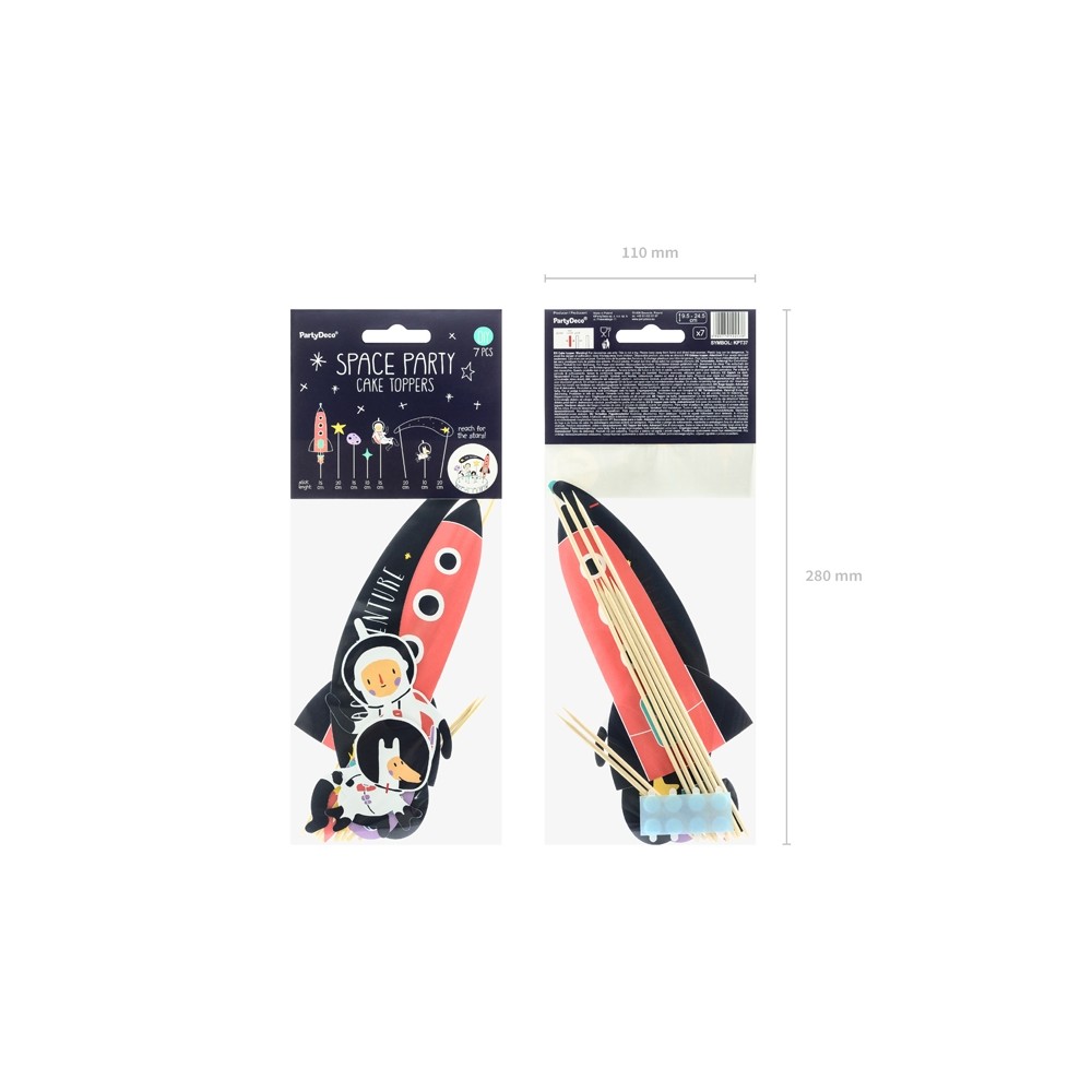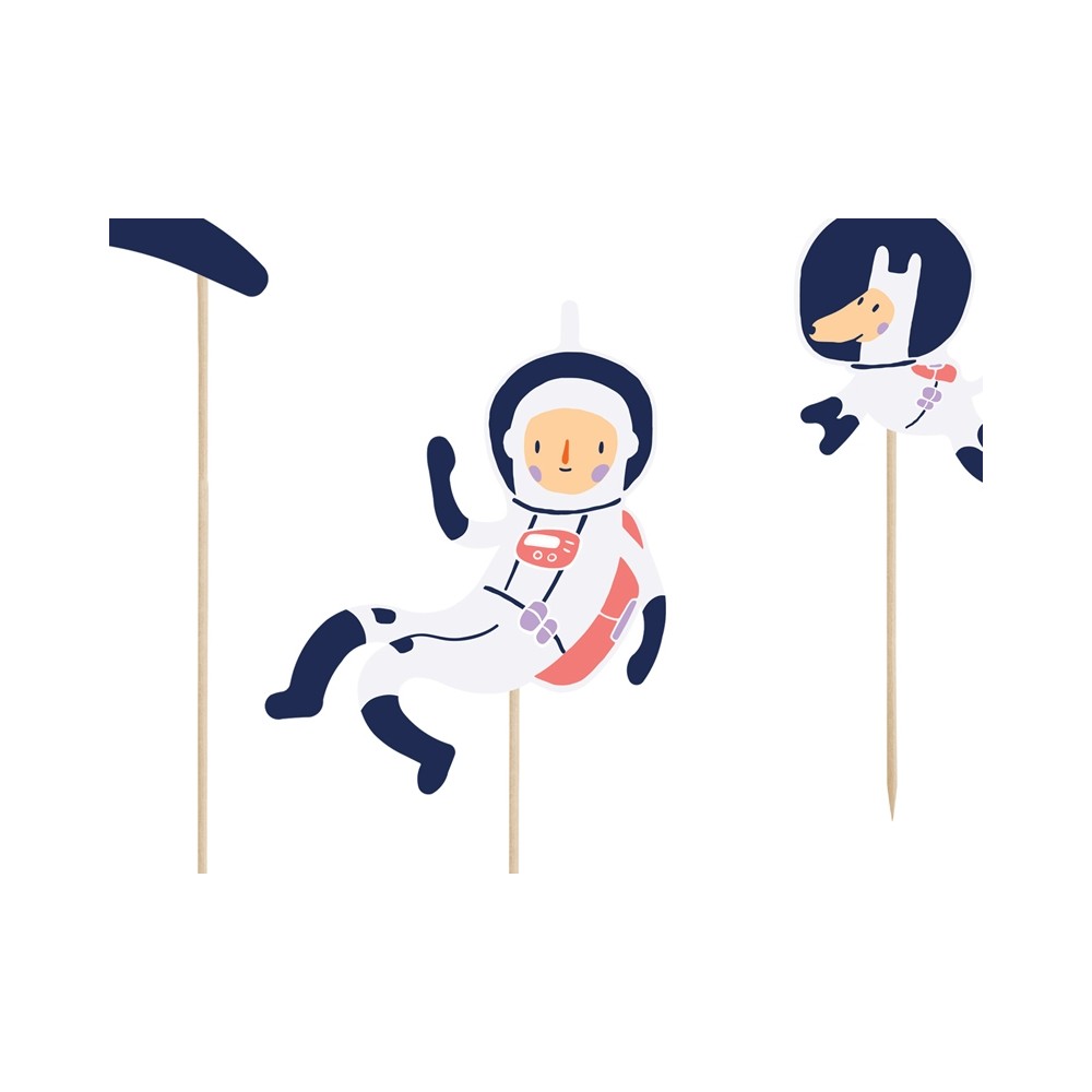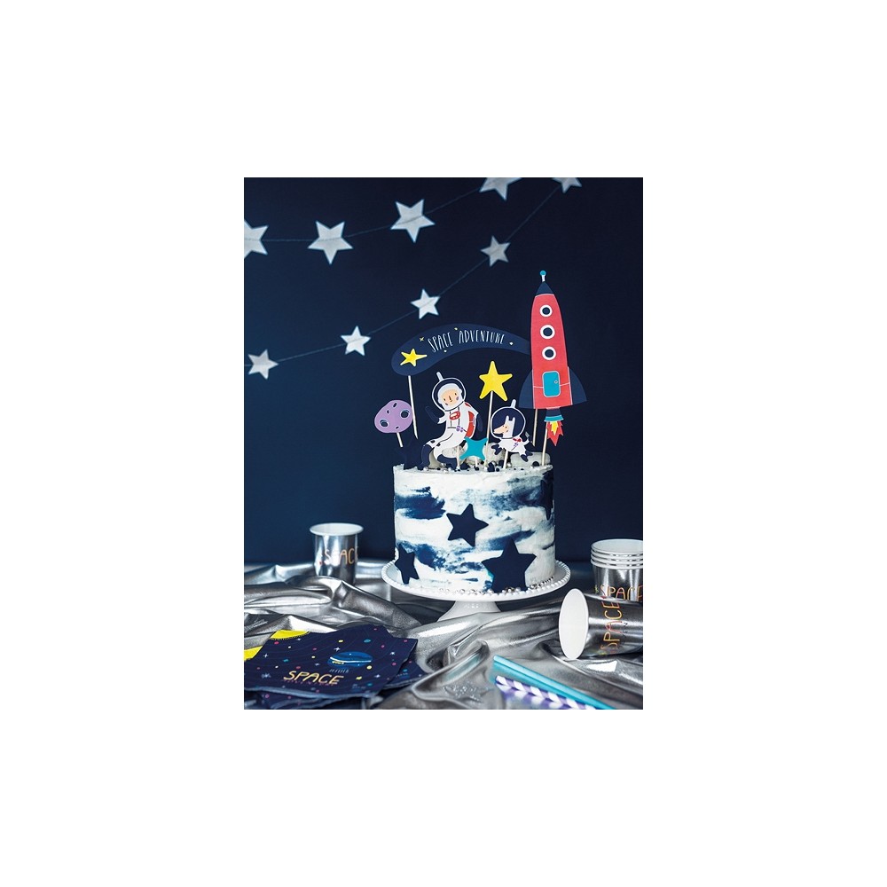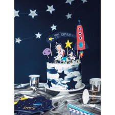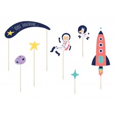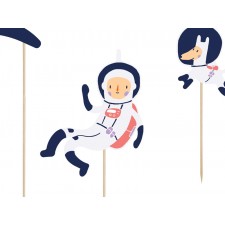Un set di 7 topper davvero spaziali! Perfetti per decorare in modo originale la torta di compleanno, soprattutto se a tema spazio! La confezione comprende 7 topper diversi: 2 stelline, un piccolo asteroide, una stella cometa con scritta "space adventure", un astronauta e la sua immancabile astronave...e una simpaticissma mascotte: un cagnolino astronauta!